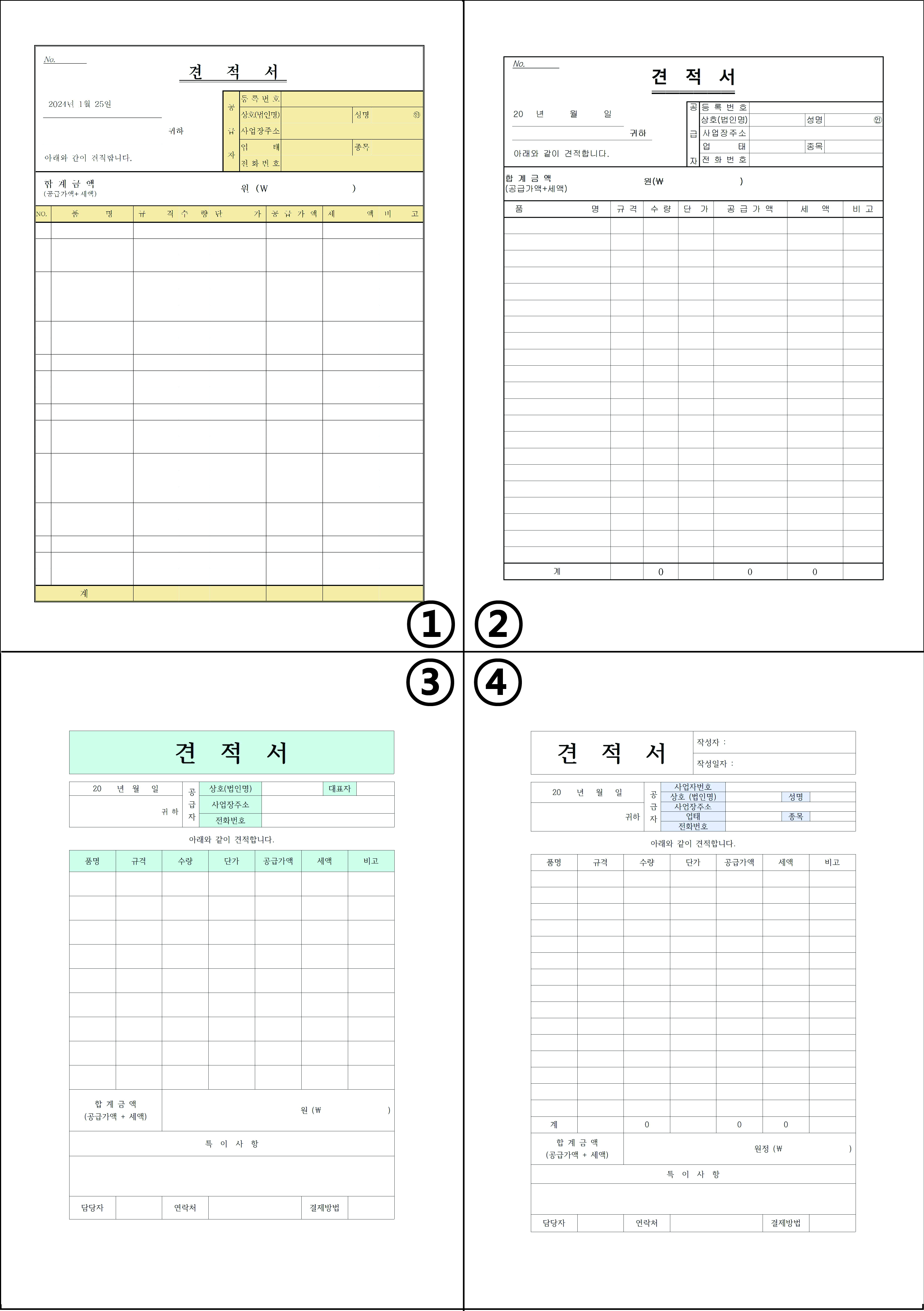 견적서는 기본적인 내용은 적어두시고 파일을 저장해두면 좋습니다. 견적서의 종류와 견적서를 쓰는 방법을 정리해 봤는데 이를 토대로 견적서를 작성하시면 됩니다. 견적서 양식 무료 다운로드는 4가지가 가능한데, 이미지로 먼저 남기겠습니다. 해당 번호에 맞는 파일을 다운로드하시면 됩니다.
