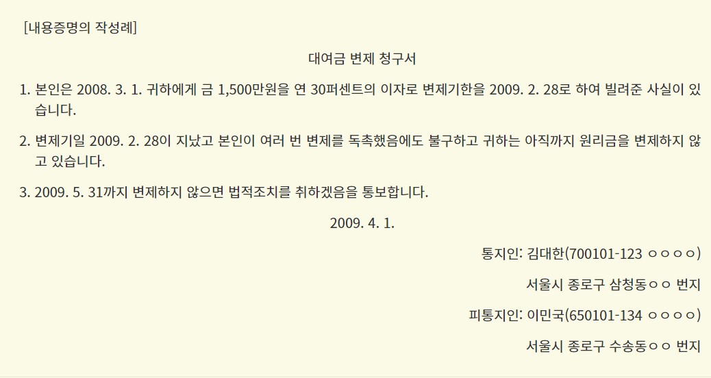 법적으로 중요한 의사표시를 증거로 남기기 위해서 문서로 전달할 때 내용증명을 보내는 것이며, 보통은 채무 문제가 해결이 되지 않을 때 보내는 것입니다.