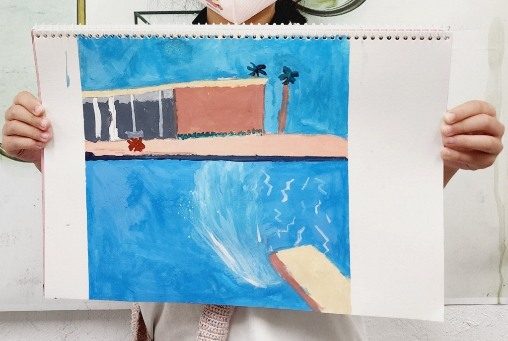 캘리포니아의 한 주택가의 한가한 적막감과 다이빙을 한 후에 튀기는 물방울들이 경쾌함을 준다는 해석을 읽었는데 데이비드 호크니의 작품은 거창한 해석이나 평론을 읽지 않더라도 그림을 보고 내가 느꼈던 그 느낌이 바로 작가가 의도했던 것이어서 그가 좋다. 이번 작품을 아이들이 그려보면서 수업 내에 여러 번 '데이비드 호크니'라는 이름을 반복적으로 이야기함으로써 아이들이 그의 이름을 외우고 "데이비드 호크니의 다른 작품은 어떤 게 있어요?" 하고 관심을 보이는 친구들이 많았으니 이번 수업은 대성공이다.