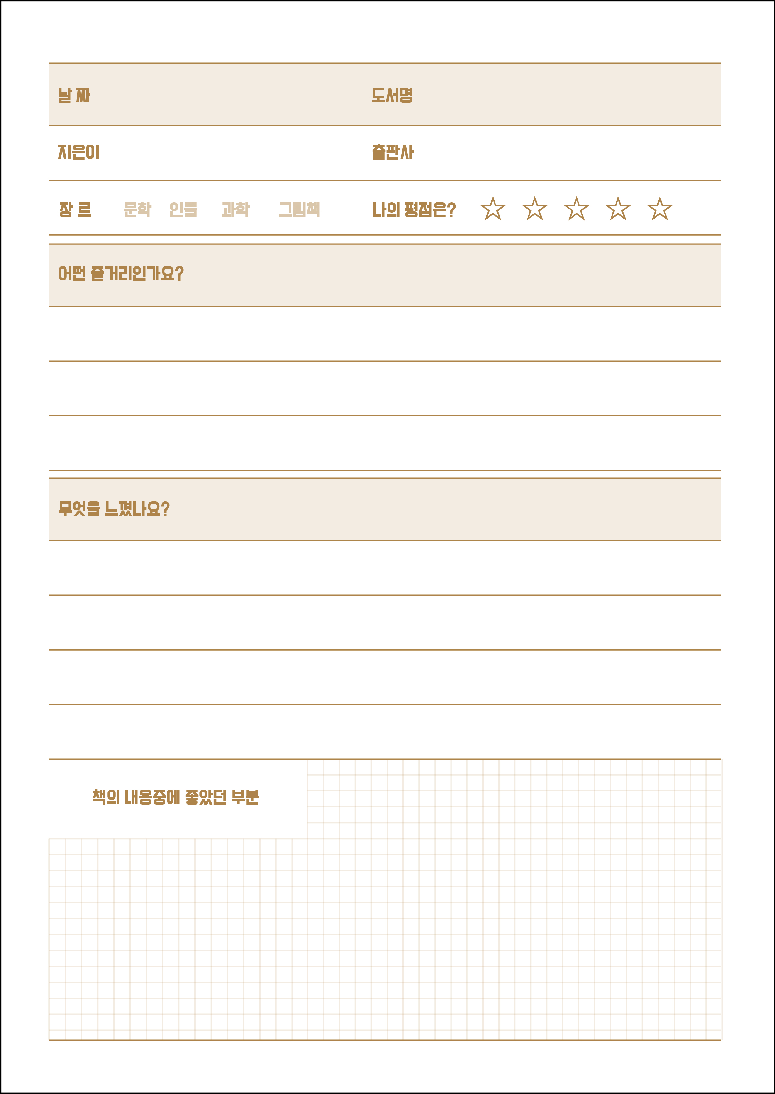 책을 많이 읽는 것도 중요하지만 내용을 정리하고 생각해볼 수 있는 시간은 꼭 필요하다고 생각합니다. 독서 기록이 생활화되면 낙서장처럼 정해진 양식없이 내용 필사와 그 옆에 느낀 점을 써도 무방하지만 습관화 되기 전에 독서기록장을 이용해보면 큰 도움이 될 것입니다.
