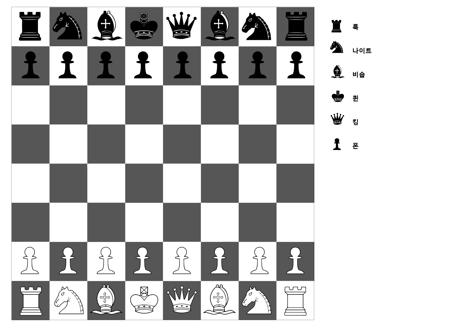 3. 각 말의 이름은 아래 체스판 옆에 적어뒀습니다. 각 코너에는 룩, 그 옆에 나이트, 비숍 순서로 배치하고 퀸은 항상 본인 색깔에 맞추어 비숍 옆에, 킹은 퀀 옆에 배치합니다.